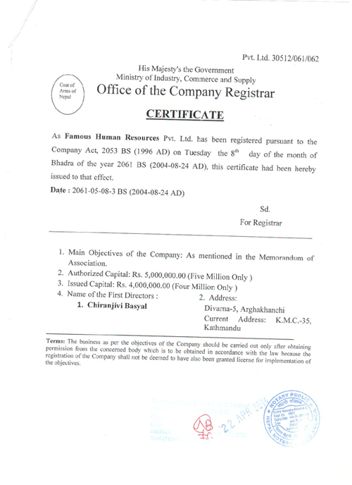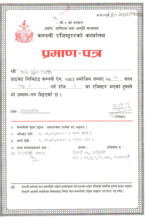 Certificate of Incorporation (Original, Nepali) |